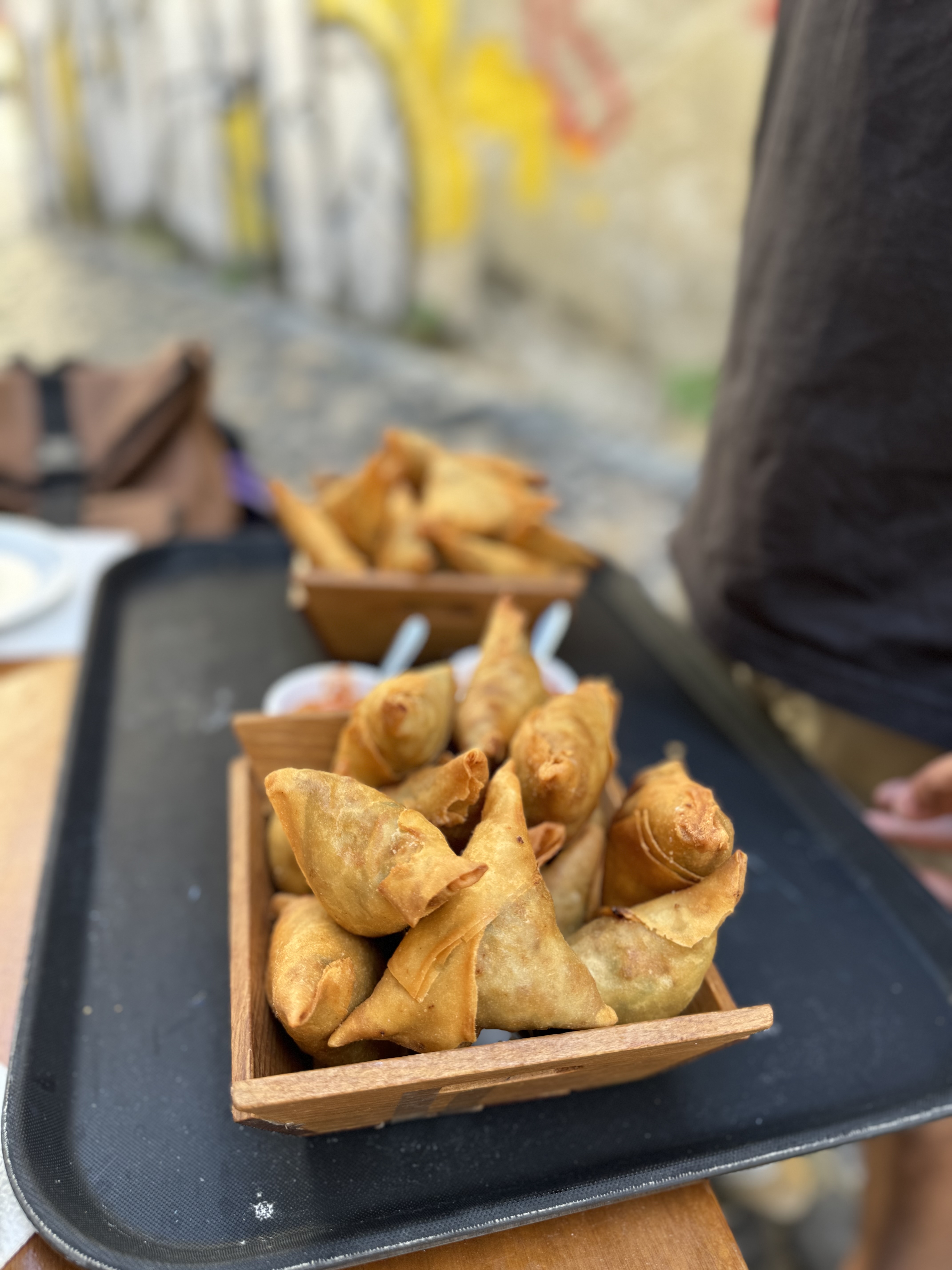 - We then went to Cantinho do Aziz where we had samosas in an interesting part of the city inhabited by a large elderly population. We also saw an interesting art project where a photographer has photographed all of the older inhabitants and then has “printed” those photos on the walls of the neighborhood.