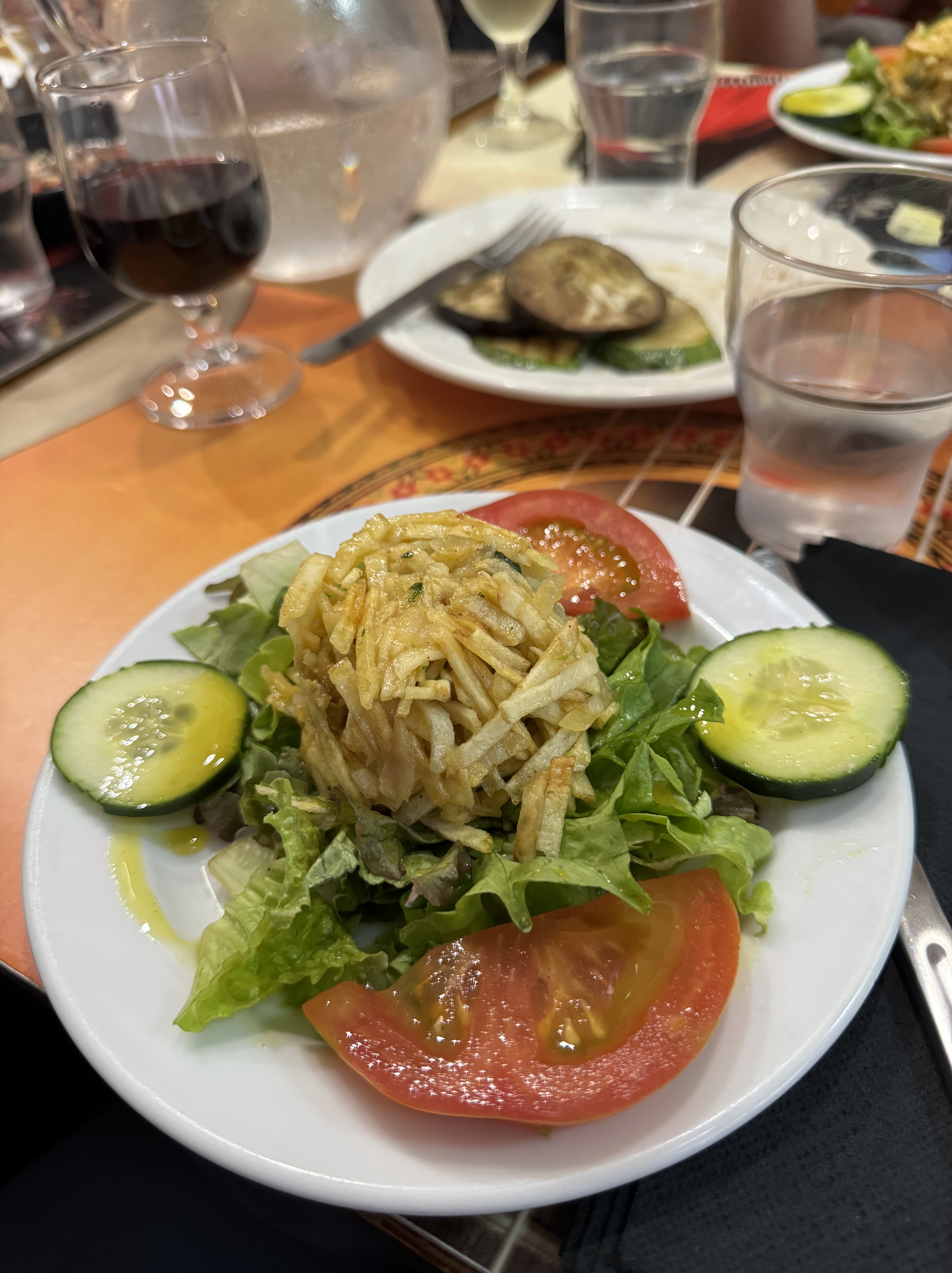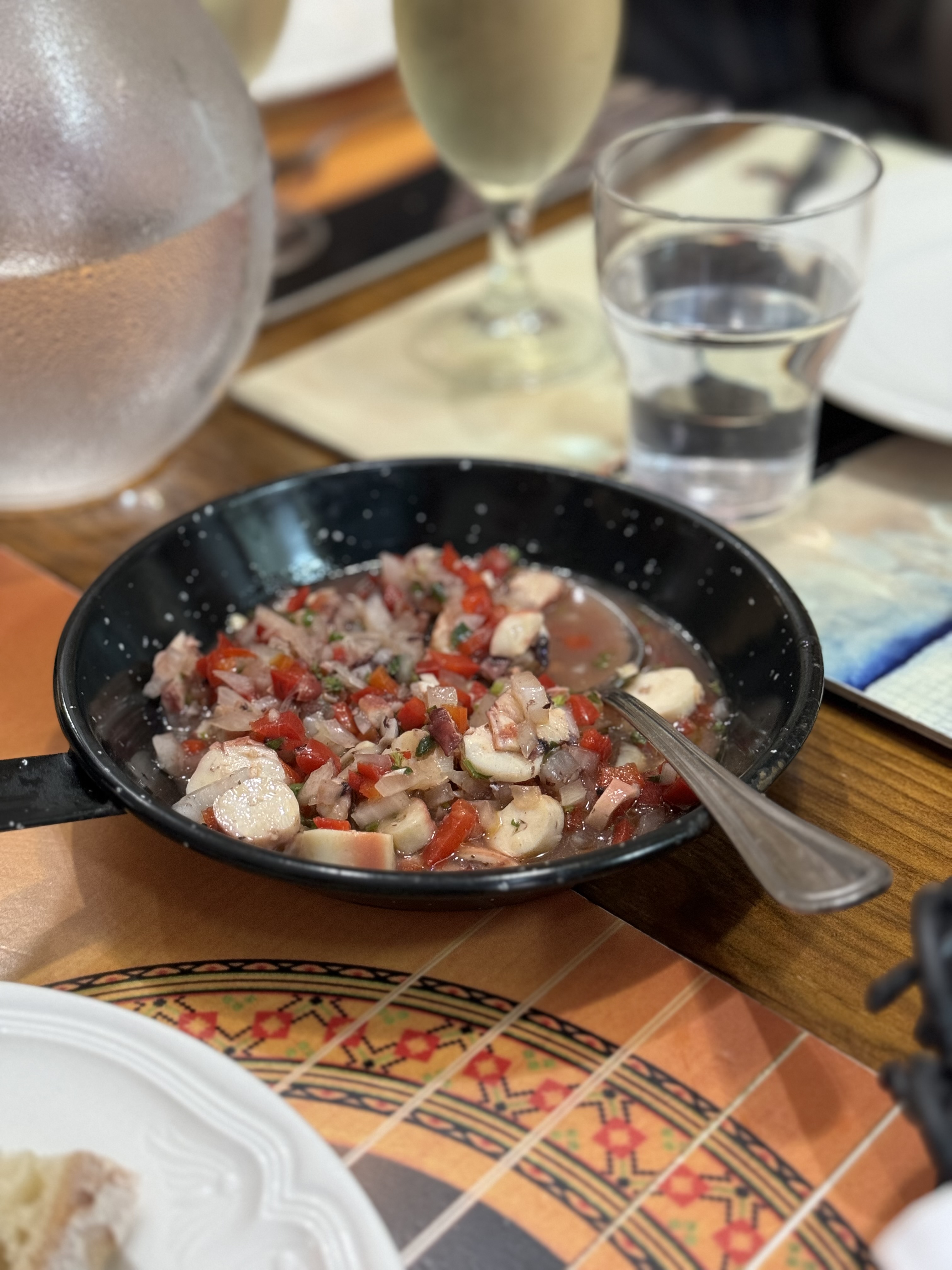 - Afterwards we went to Tasquinha Canto do Fado. Here we tried the veggies, roast potatoes, octopus salad and, as a main dish, Bacalhau à Brás (potato and cod salad). We also tried homemade ginjinha for dessert.
