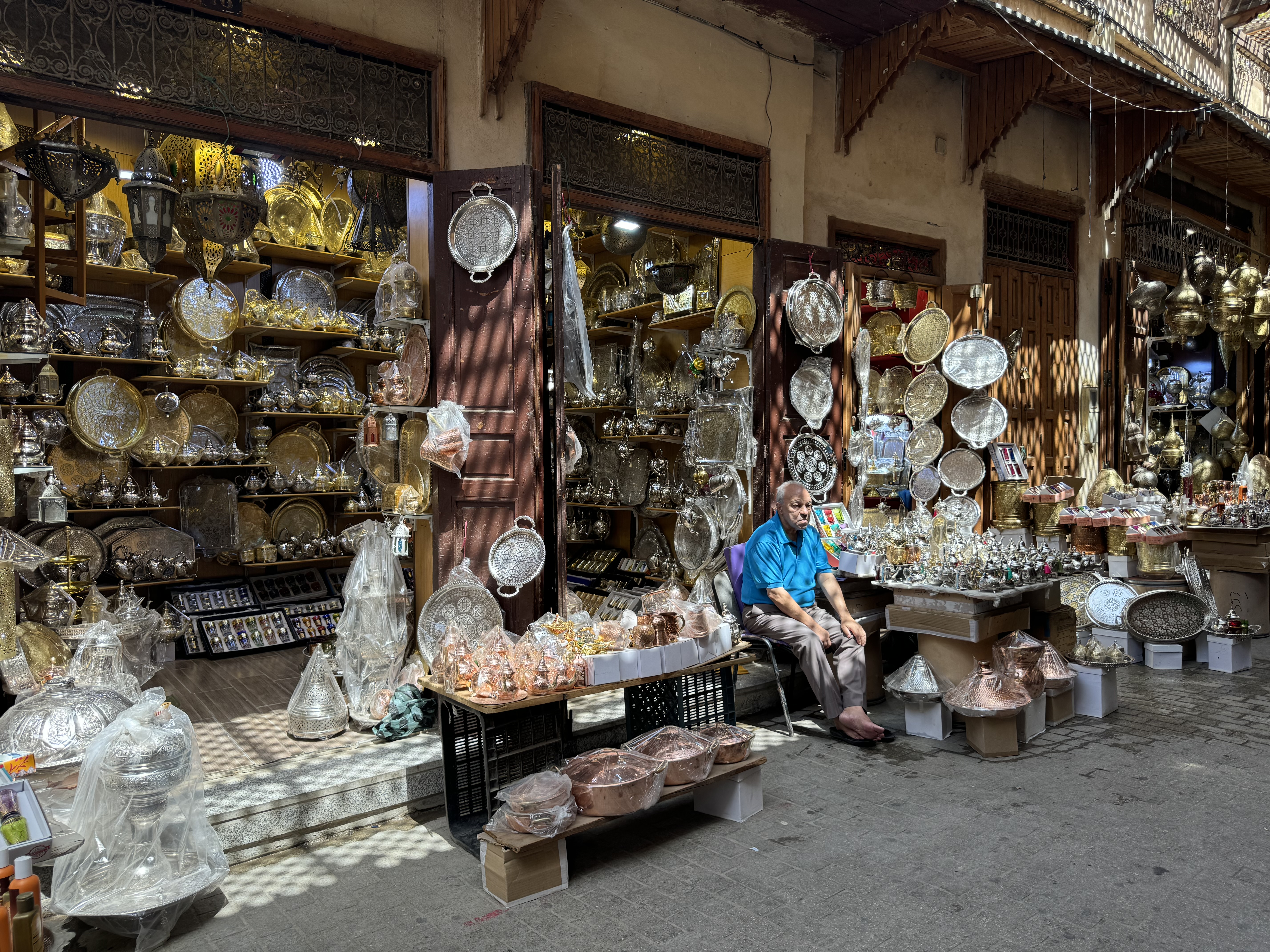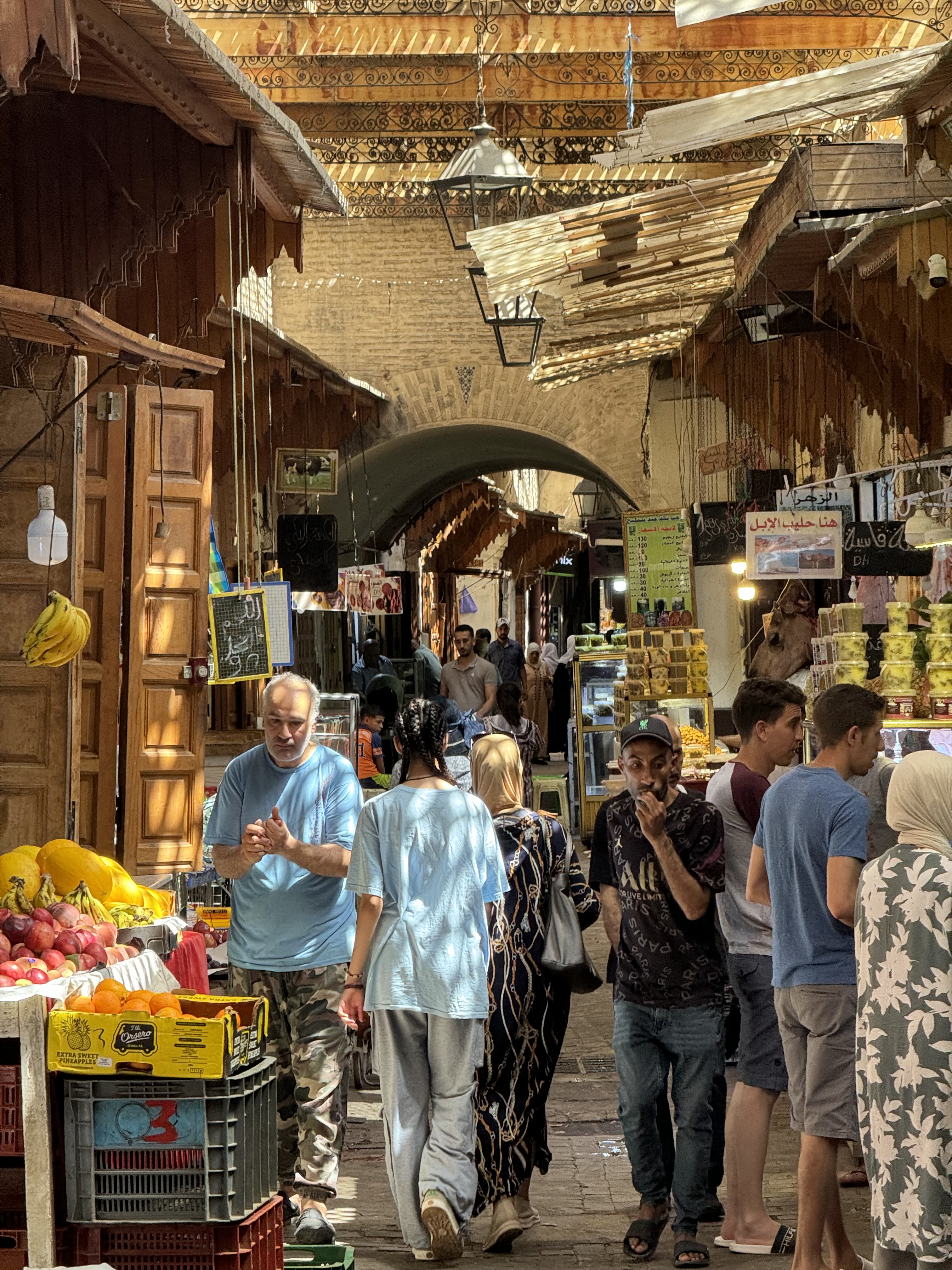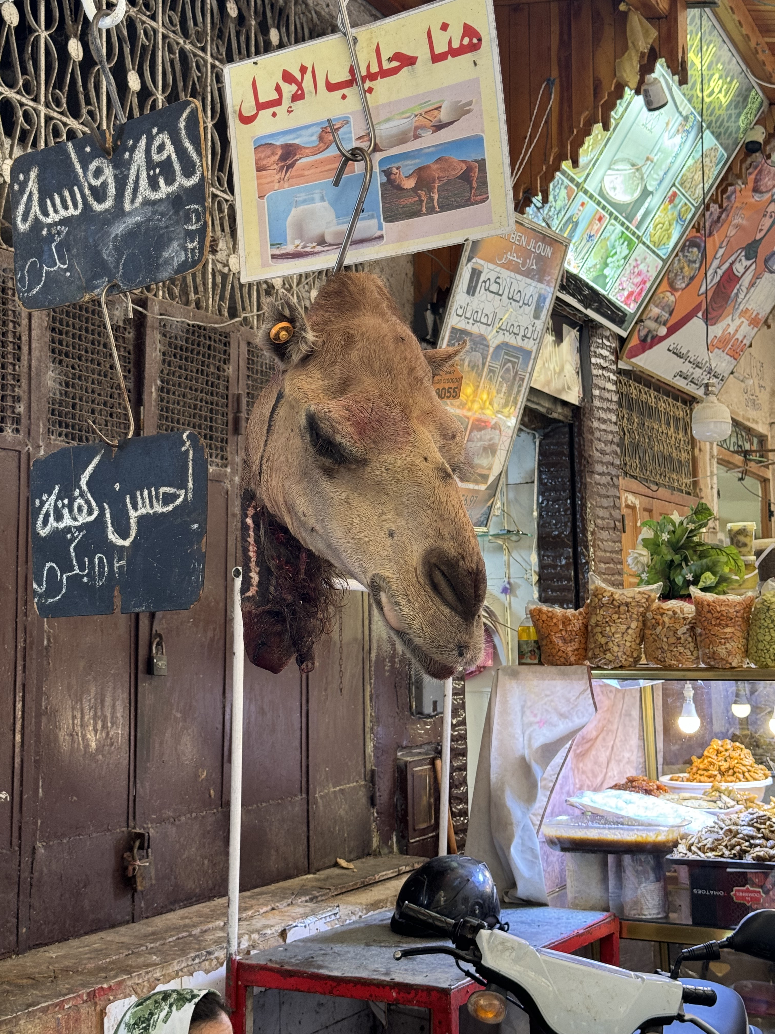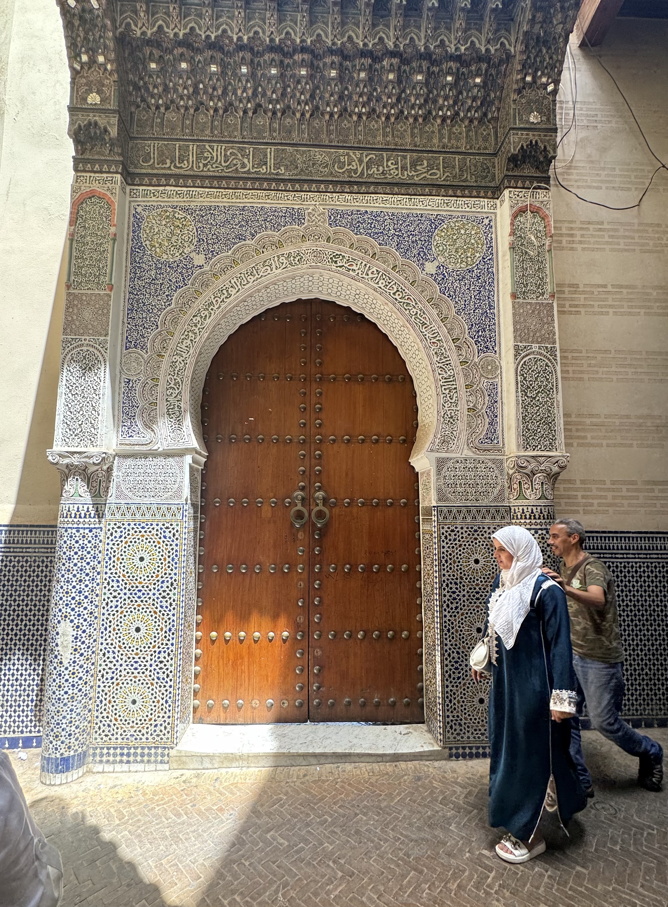 Today we explored Fes with a local guide. We started at the Royal Palace, then visited the old Jewish quarter, followed by a scenic overlook, and then stopped by a ceramics school that attracts students from all over the world. Finally, we explored the old Medina. The Medina is so complicated and convoluted that a local guide is required. There is no way anyone could navigate the over 9,400 streets and alleyways if they did not already know the layout. The Medina is a self-sustaining city within a city. It was founded between 789 and 808 A.D. and is considered as one of the most extensive and best conserved historic towns of the Arab-Muslim world. Inside the Medina you can find schools, fondouks (mediaeval building designed as an urban hostel for commercial travellers and merchants), palaces, residences, mosques (over 300), fountains, and any type of merchant, store, or craftsperson you think of, even a camel butcher.