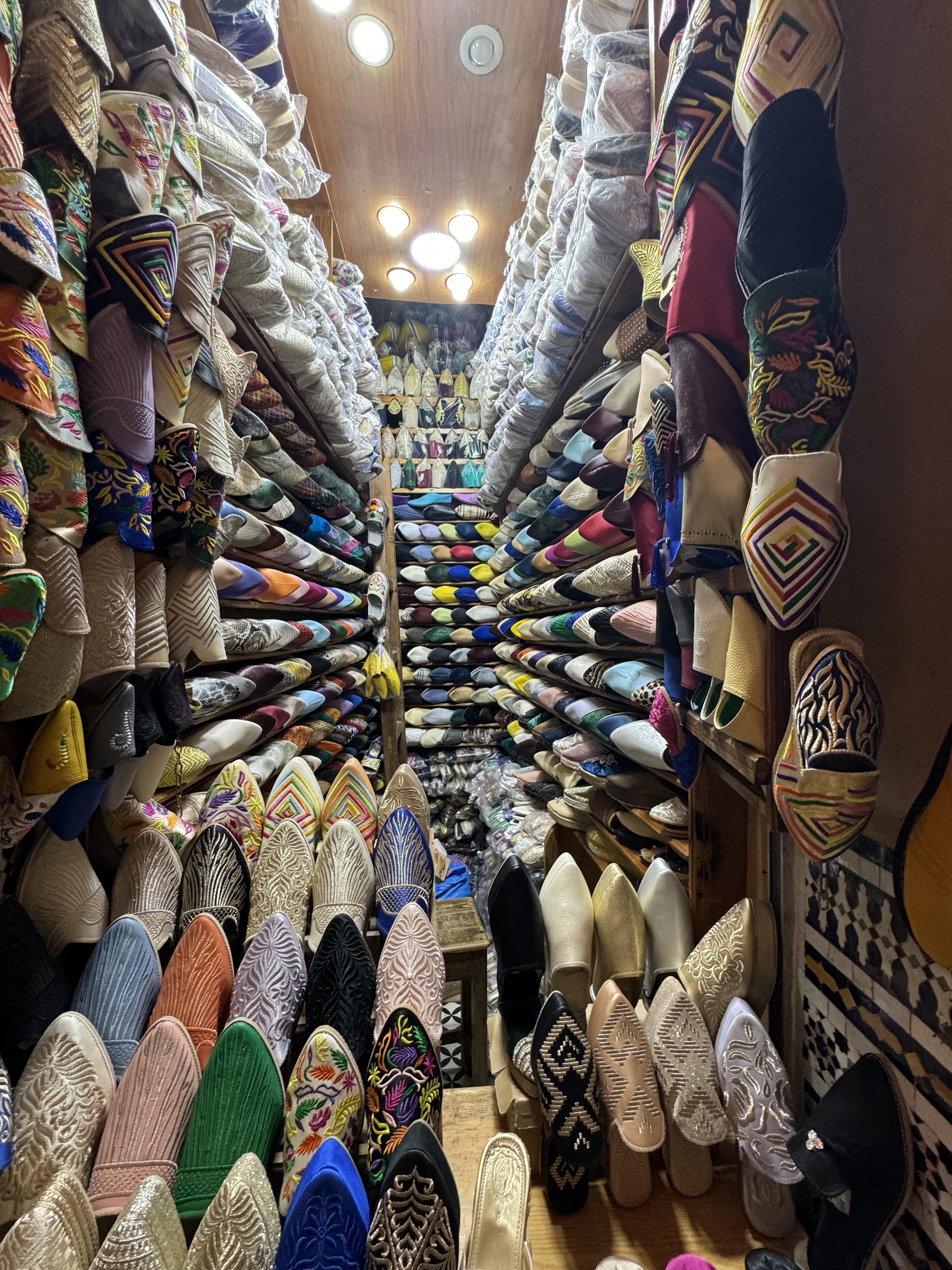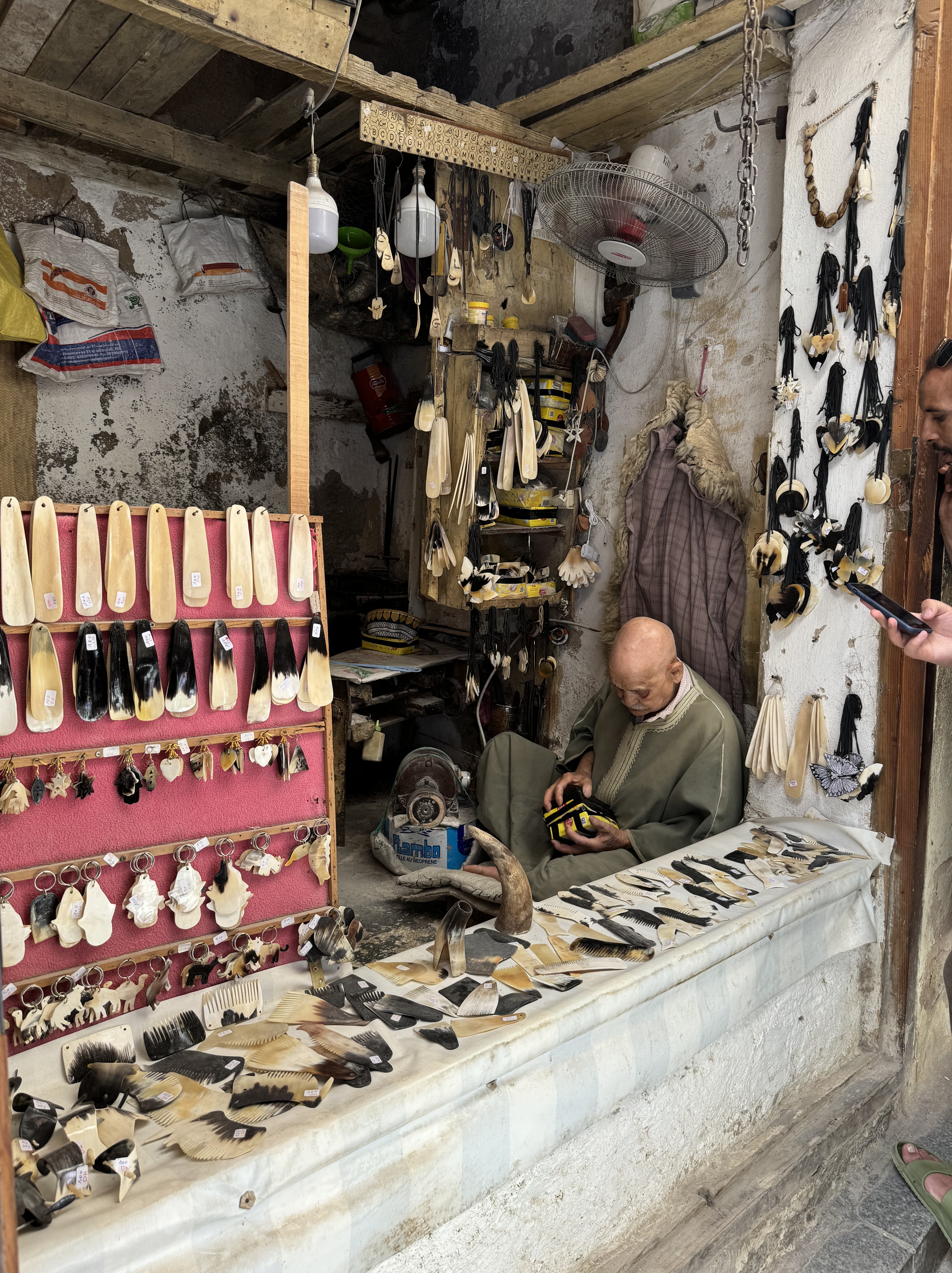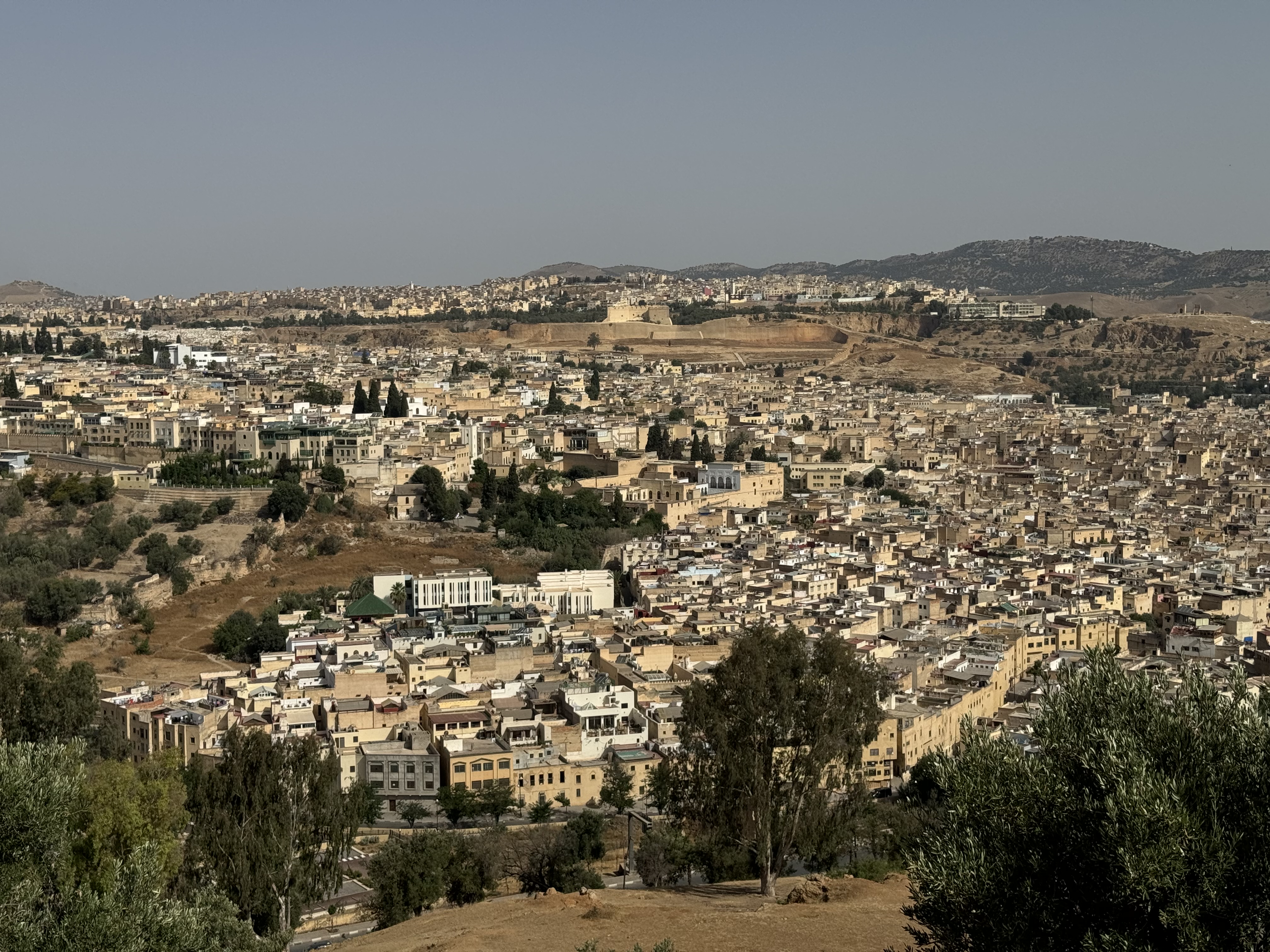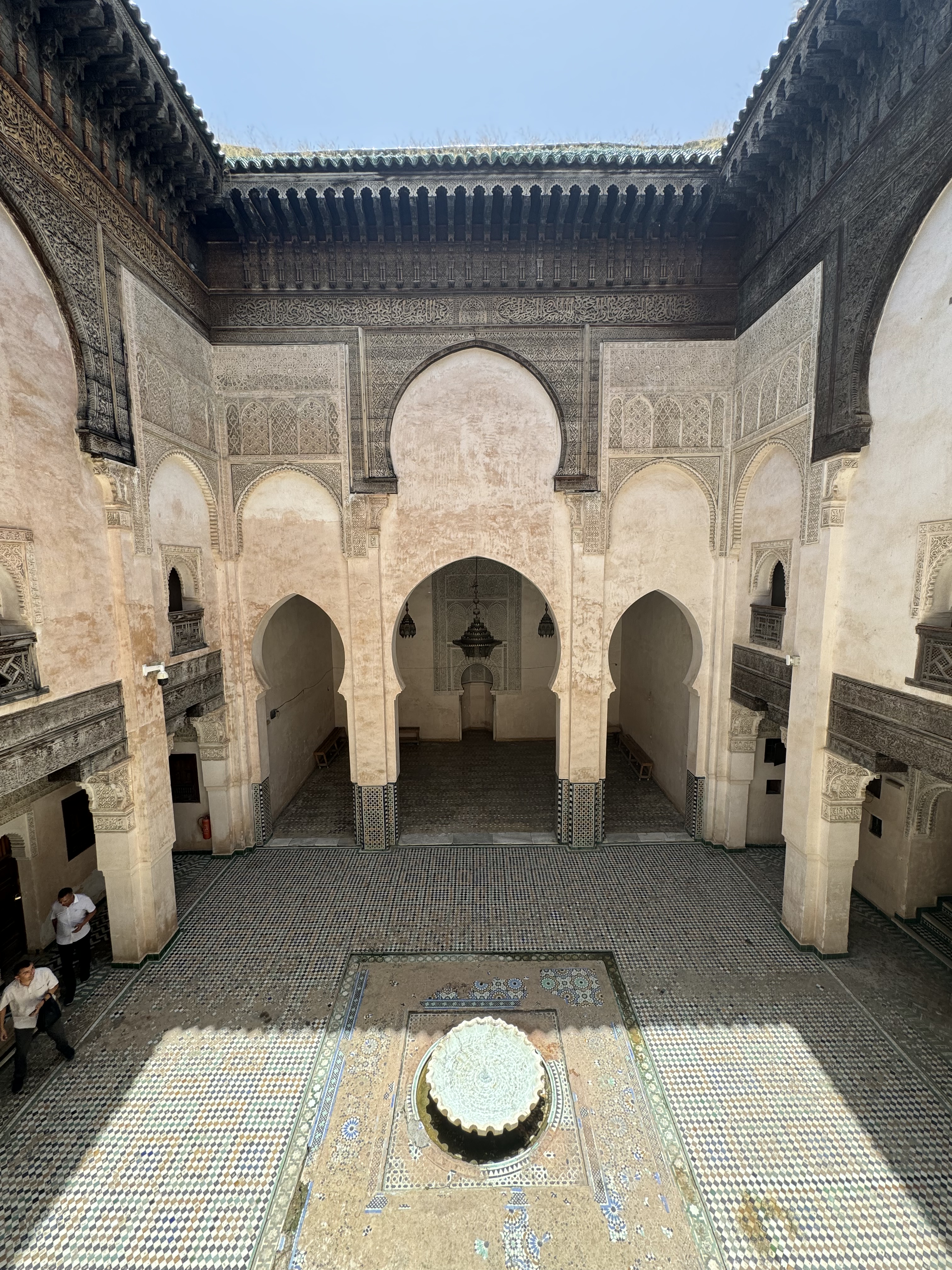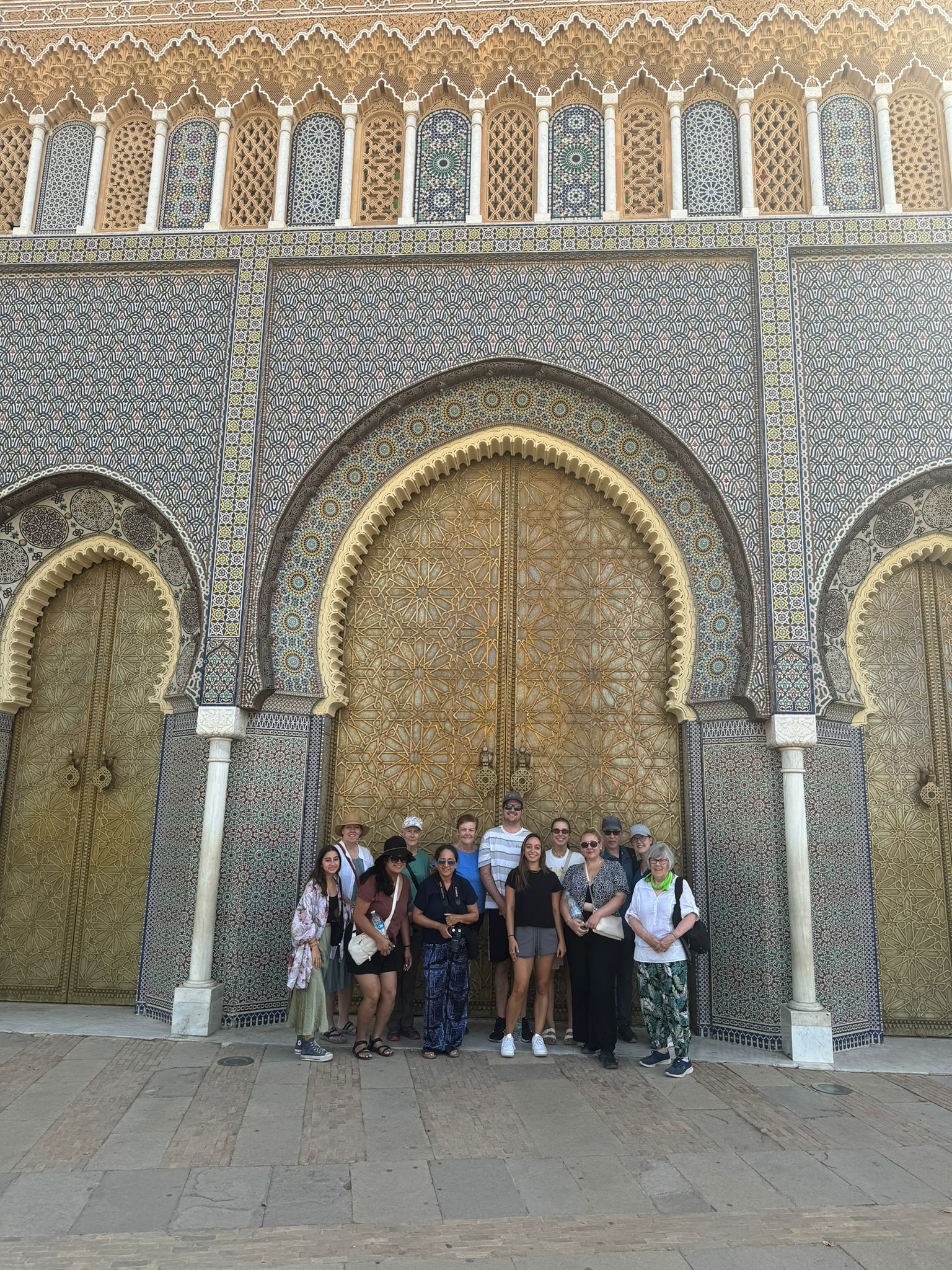 Today we explored Fes with a local guide. We started at the Royal Palace, then visited the old Jewish quarter, followed by a scenic overlook, and then stopped by a ceramics school that attracts students from all over the world. Finally, we explored the old Medina. The Medina is so complicated and convoluted that a local guide is required. There is no way anyone could navigate the over 9,400 streets and alleyways if they did not already know the layout. The Medina is a self-sustaining city within a city. It was founded between 789 and 808 A.D. and is considered as one of the most extensive and best conserved historic towns of the Arab-Muslim world. Inside the Medina you can find schools, fondouks (mediaeval building designed as an urban hostel for commercial travellers and merchants), palaces, residences, mosques (over 300), fountains, and any type of merchant, store, or craftsperson you think of, even a camel butcher.