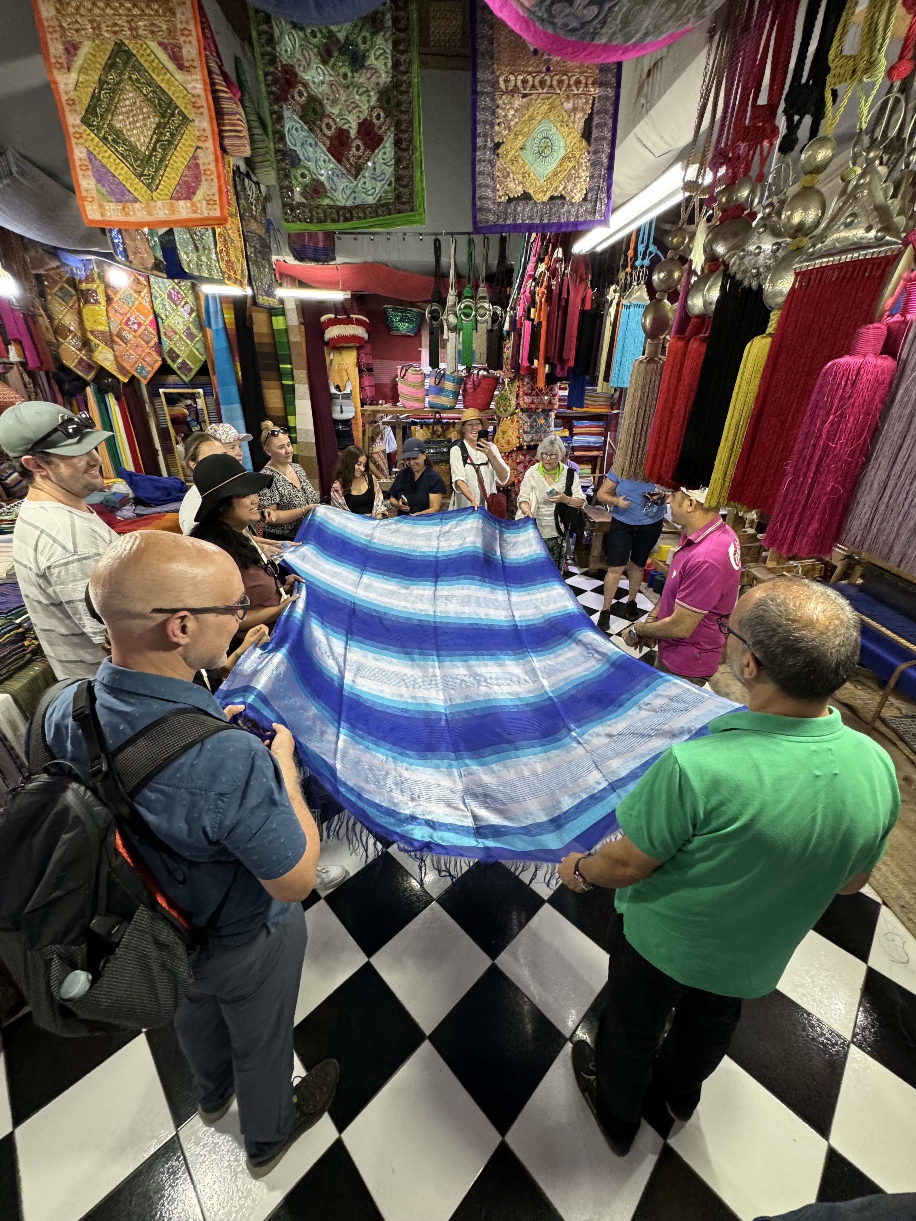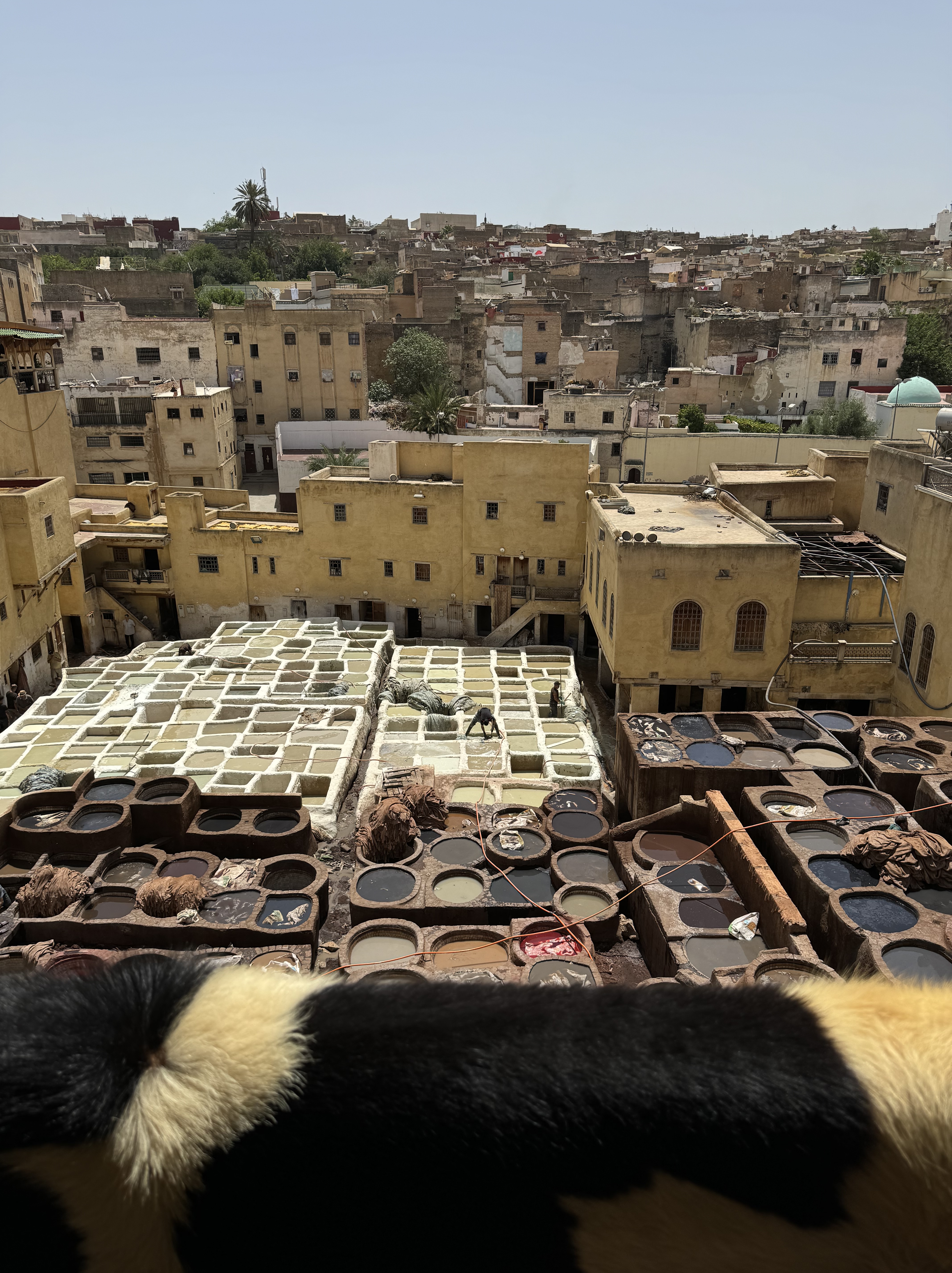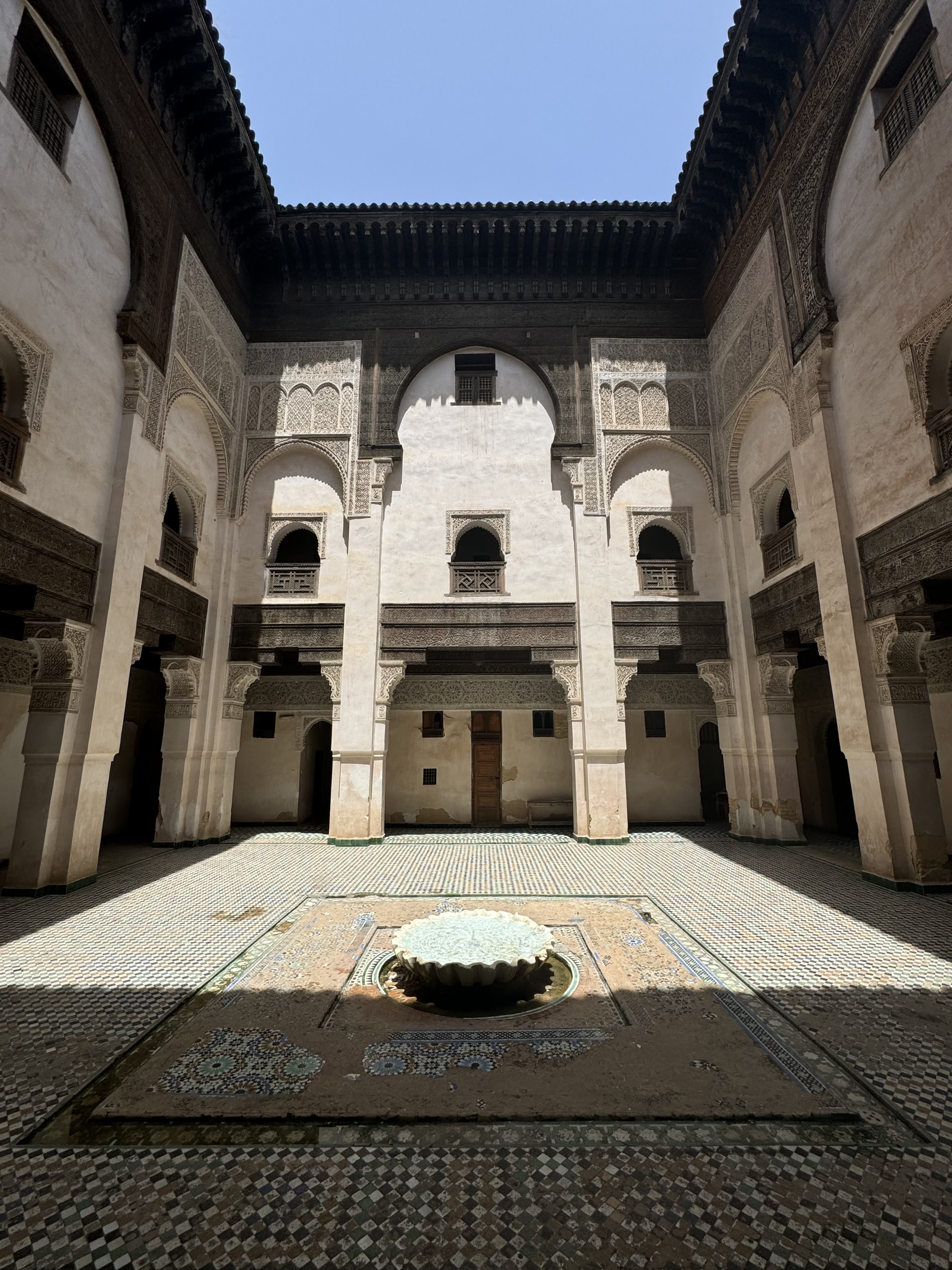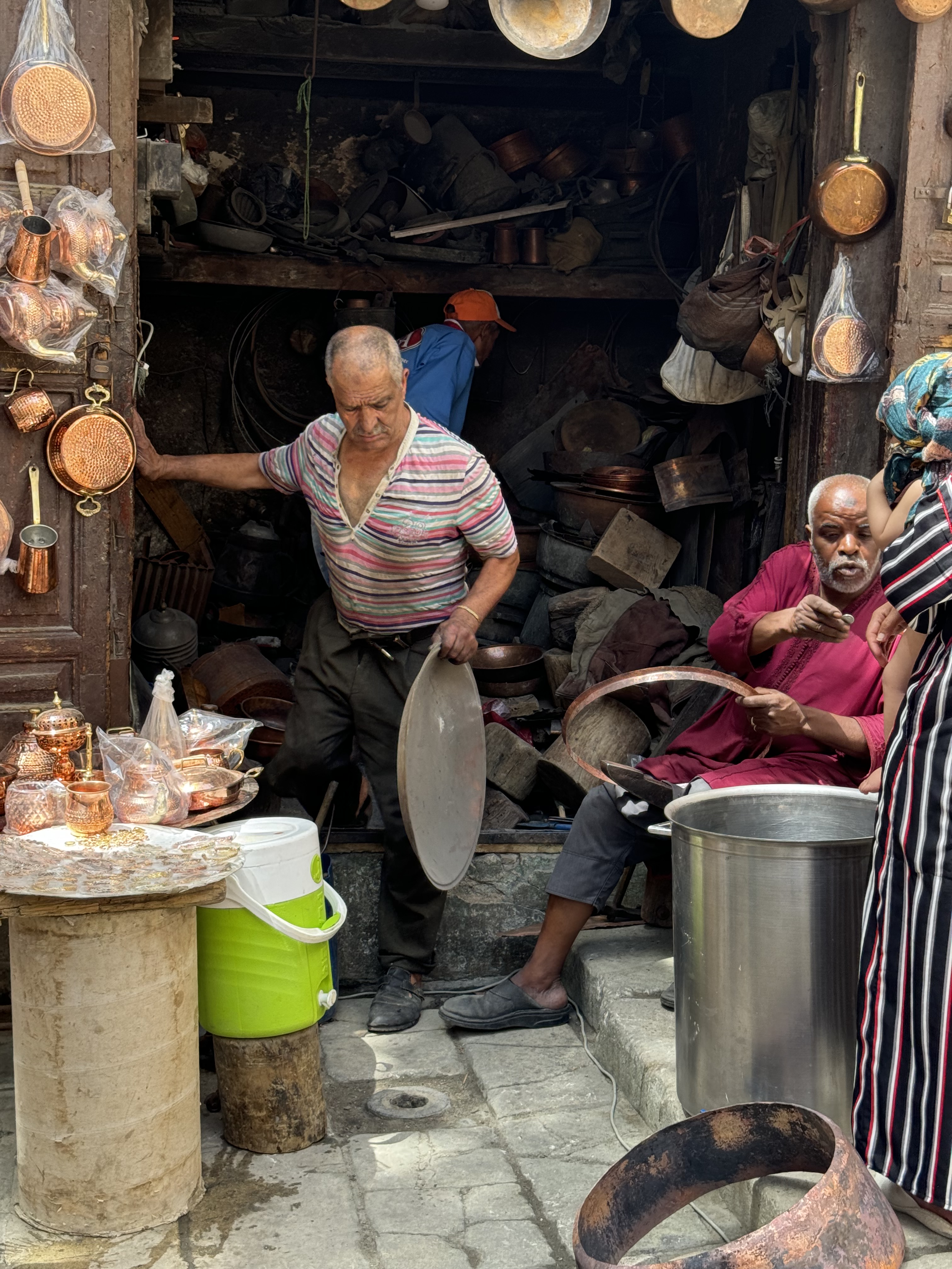 Today we explored Fes with a local guide. We started at the Royal Palace, then visited the old Jewish quarter, followed by a scenic overlook, and then stopped by a ceramics school that attracts students from all over the world. Finally, we explored the old Medina. The Medina is so complicated and convoluted that a local guide is required. There is no way anyone could navigate the over 9,400 streets and alleyways if they did not already know the layout. The Medina is a self-sustaining city within a city. It was founded between 789 and 808 A.D. and is considered as one of the most extensive and best conserved historic towns of the Arab-Muslim world. Inside the Medina you can find schools, fondouks (mediaeval building designed as an urban hostel for commercial travellers and merchants), palaces, residences, mosques (over 300), fountains, and any type of merchant, store, or craftsperson you think of, even a camel butcher.
