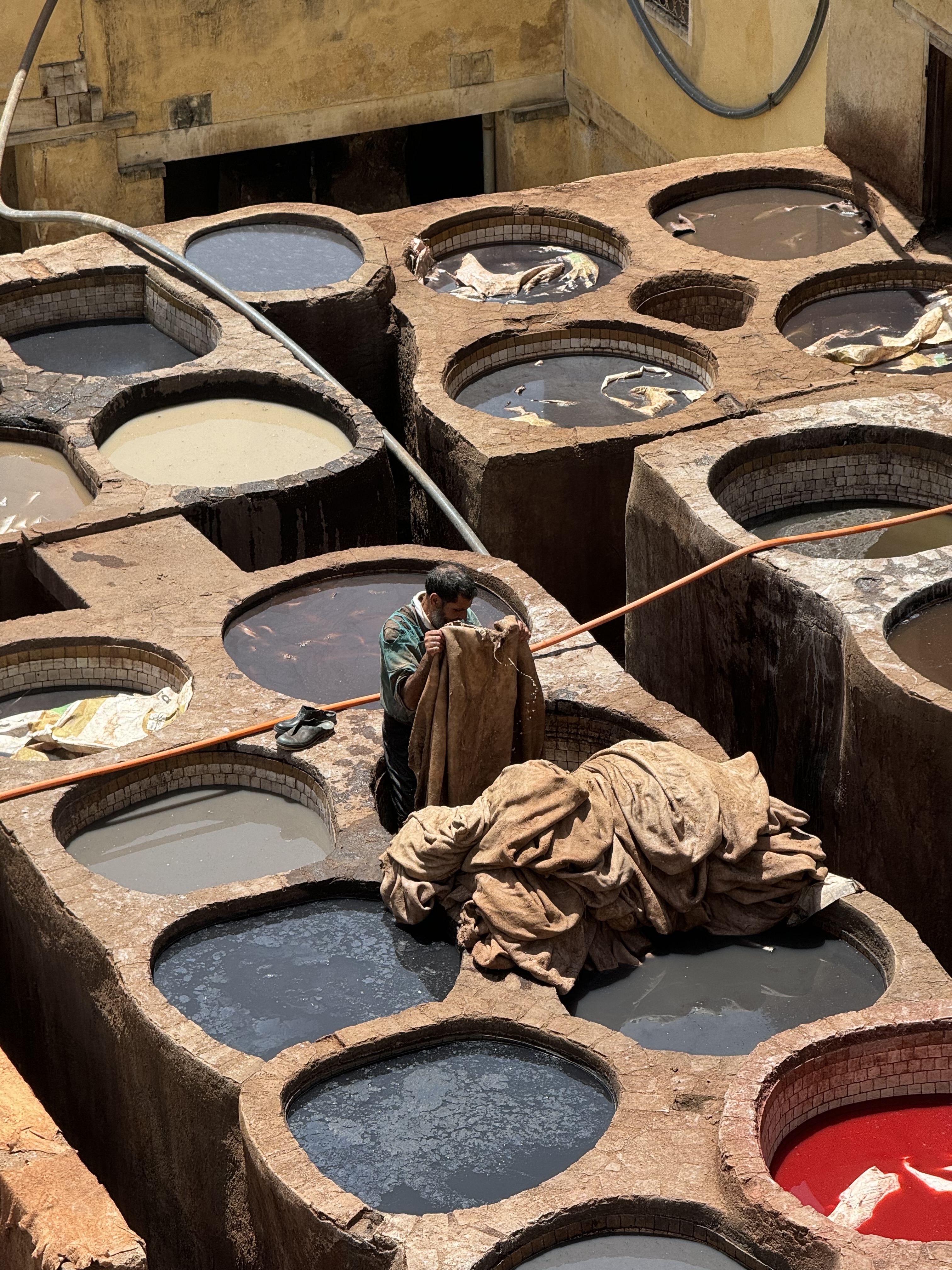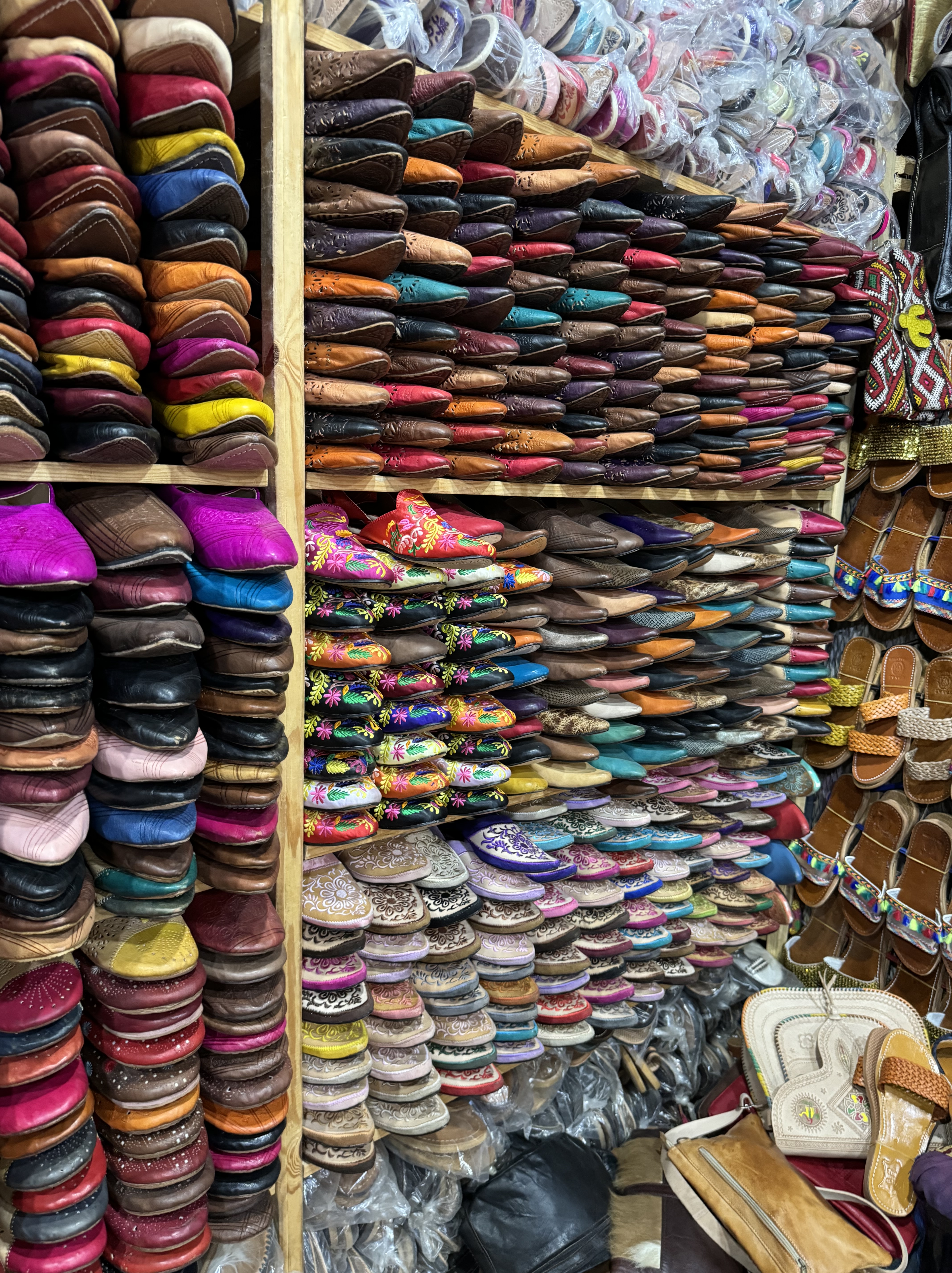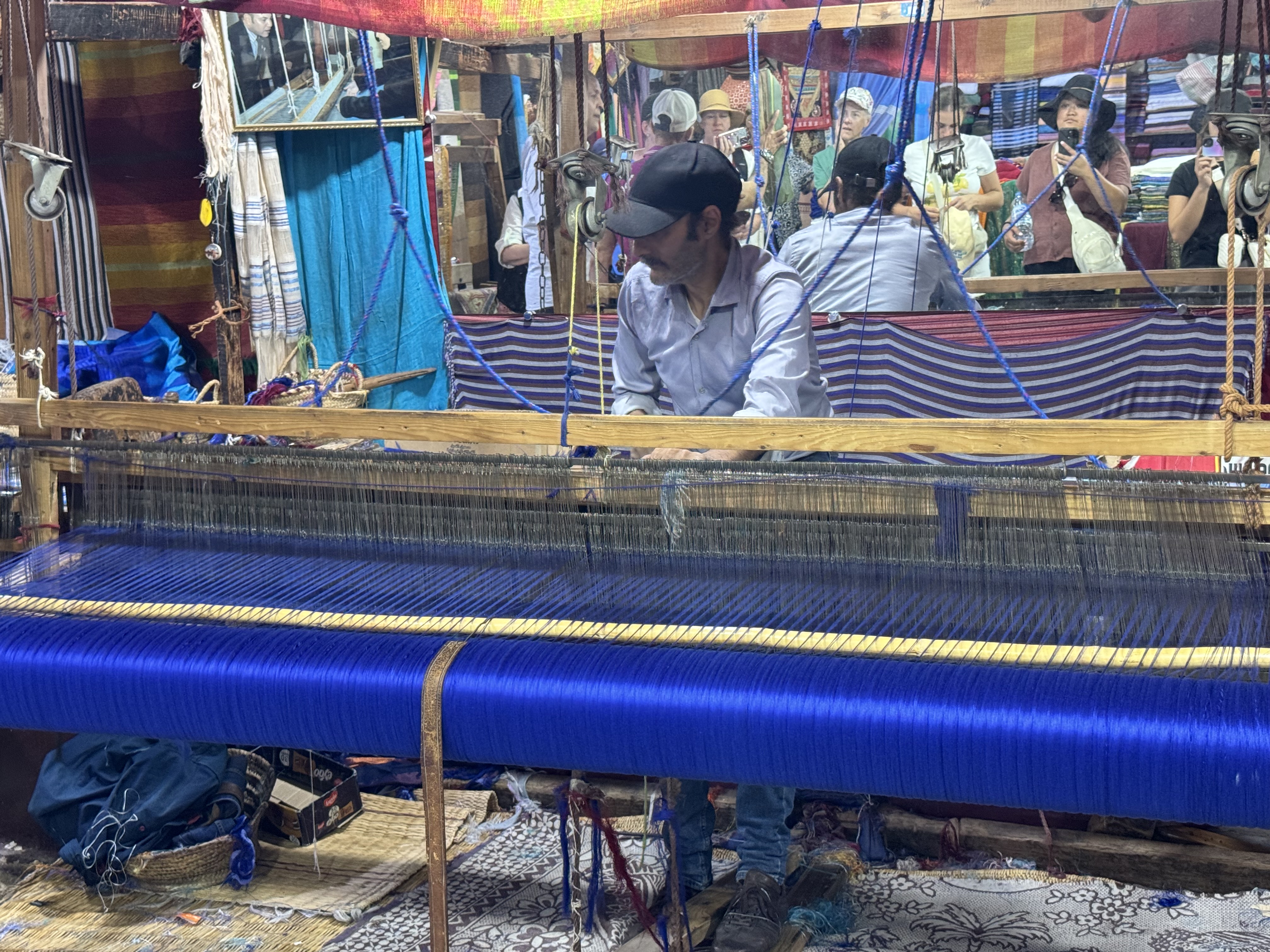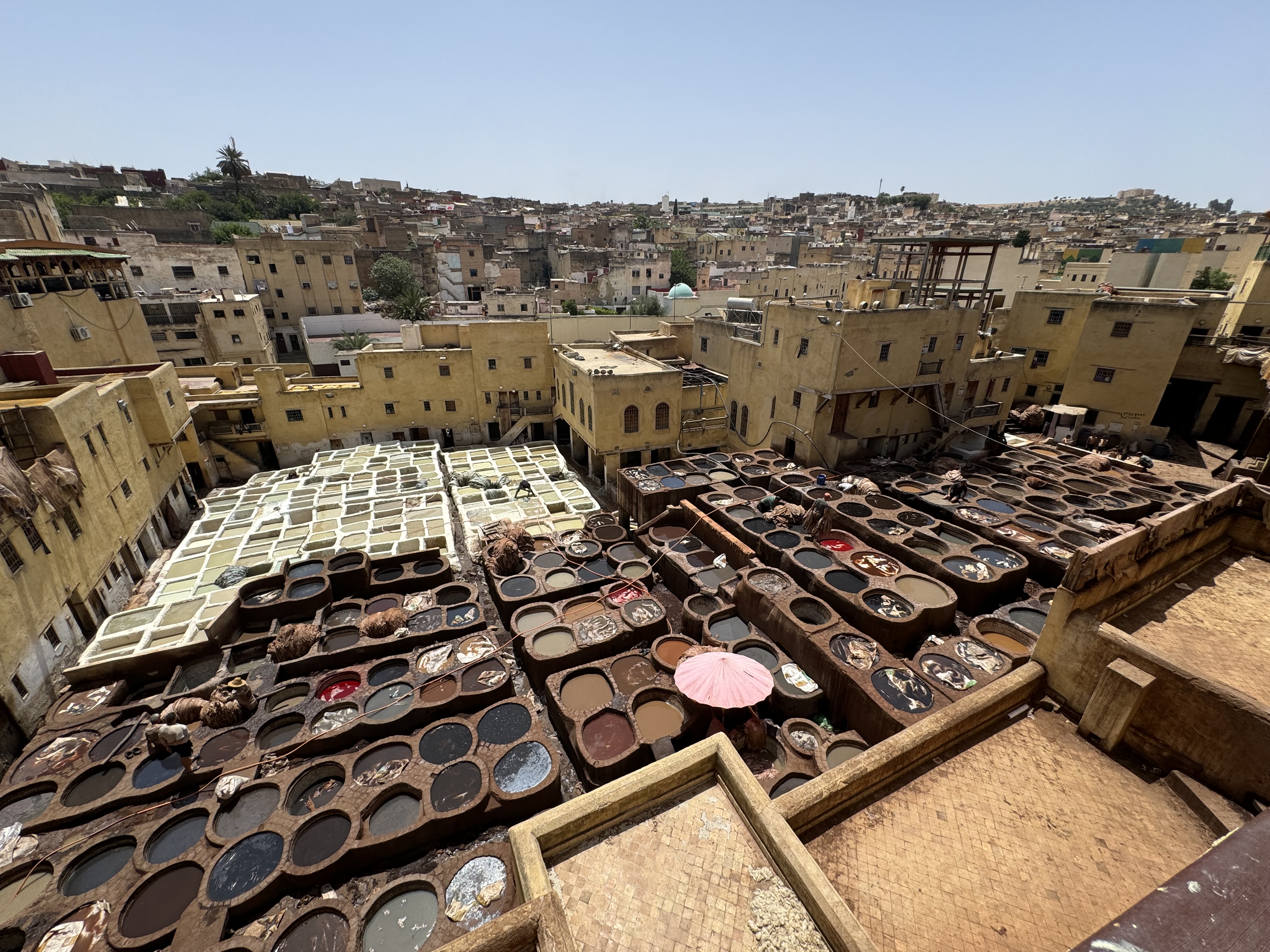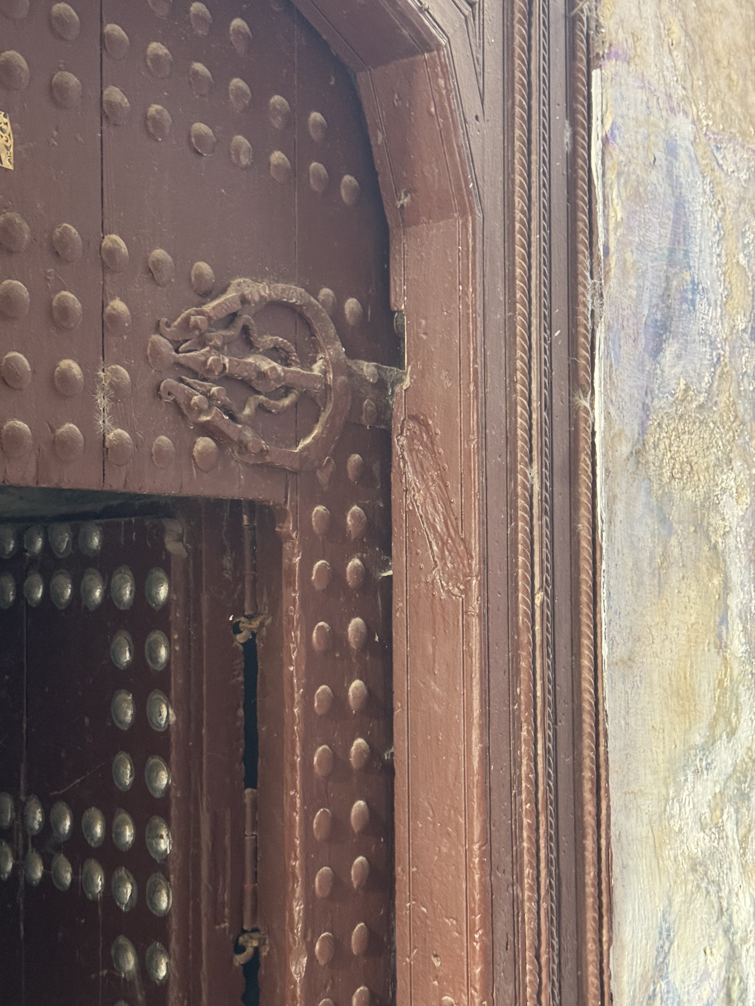 Today we explored Fes with a local guide. We started at the Royal Palace, then visited the old Jewish quarter, followed by a scenic overlook, and then stopped by a ceramics school that attracts students from all over the world. Finally, we explored the old Medina. The Medina is so complicated and convoluted that a local guide is required. There is no way anyone could navigate the over 9,400 streets and alleyways if they did not already know the layout. The Medina is a self-sustaining city within a city. It was founded between 789 and 808 A.D. and is considered as one of the most extensive and best conserved historic towns of the Arab-Muslim world. Inside the Medina you can find schools, fondouks (mediaeval building designed as an urban hostel for commercial travellers and merchants), palaces, residences, mosques (over 300), fountains, and any type of merchant, store, or craftsperson you think of, even a camel butcher.