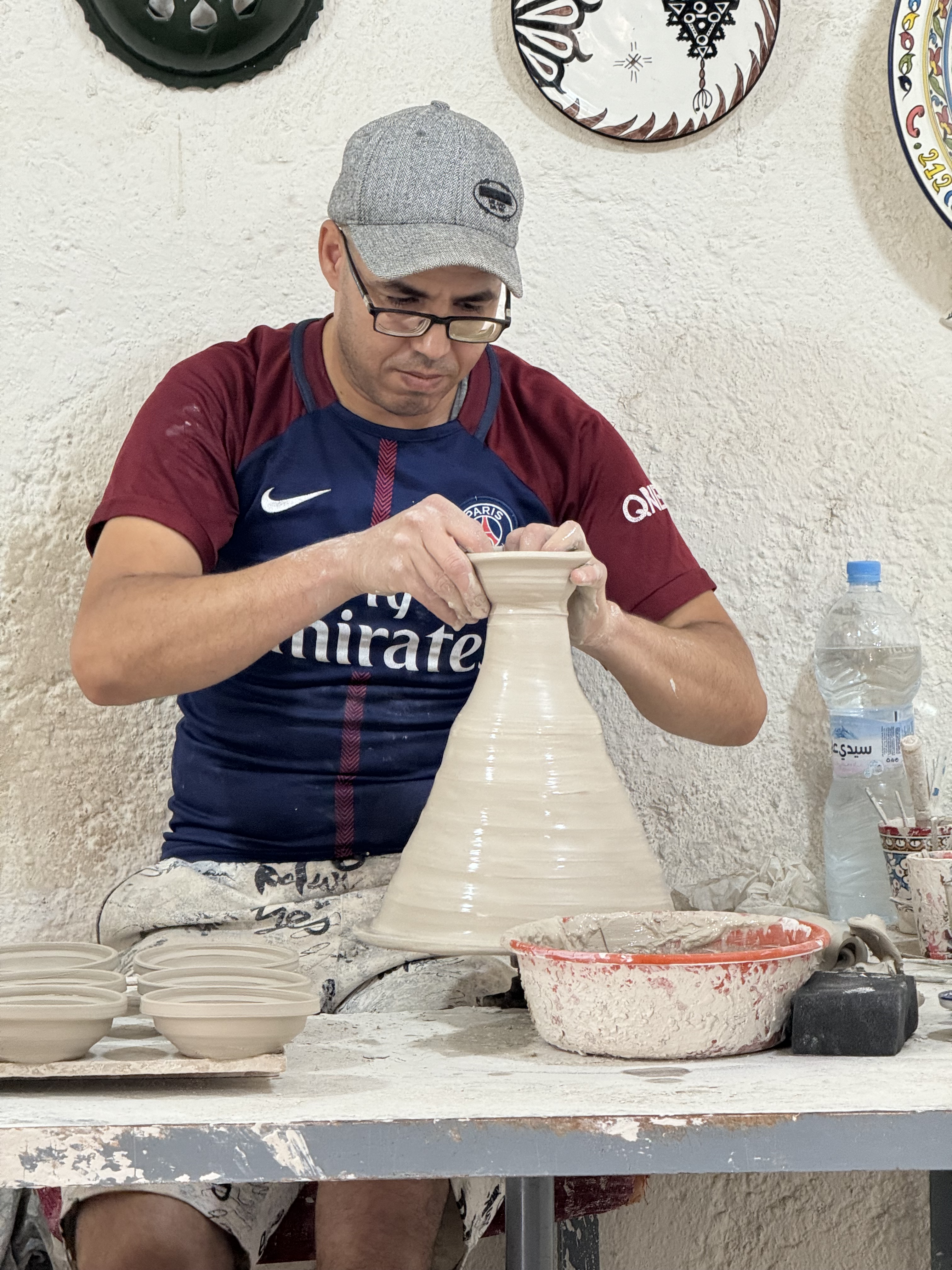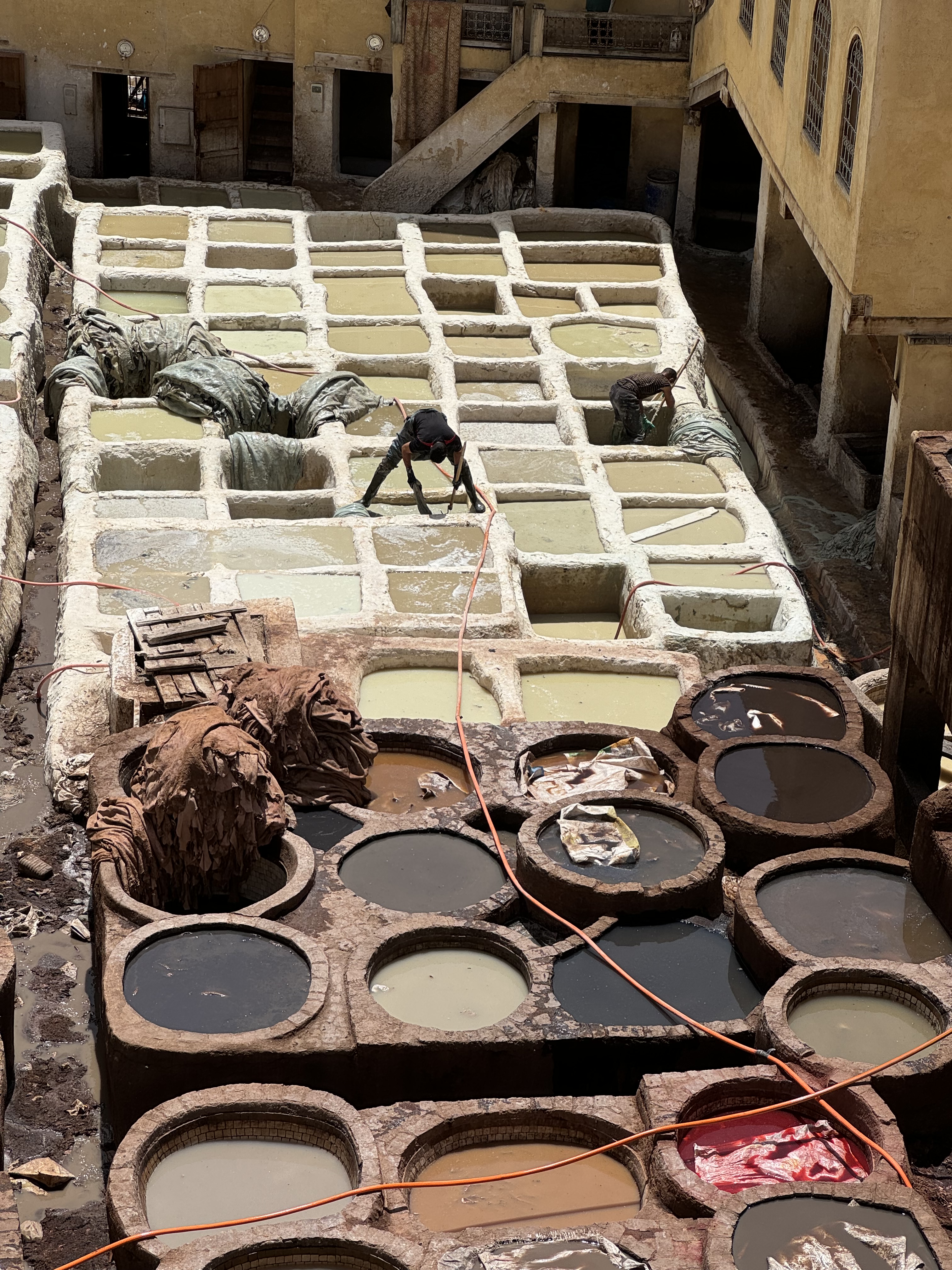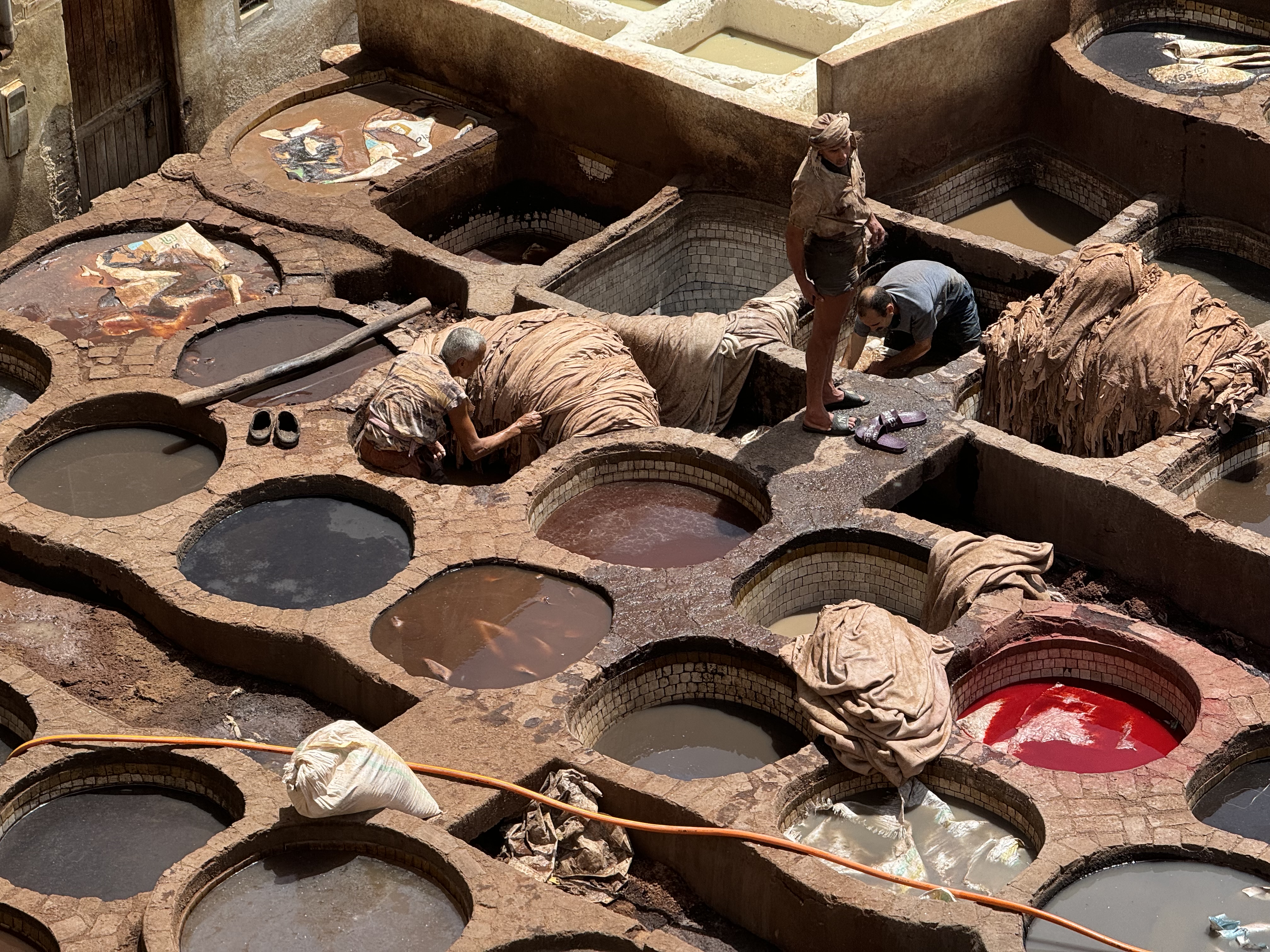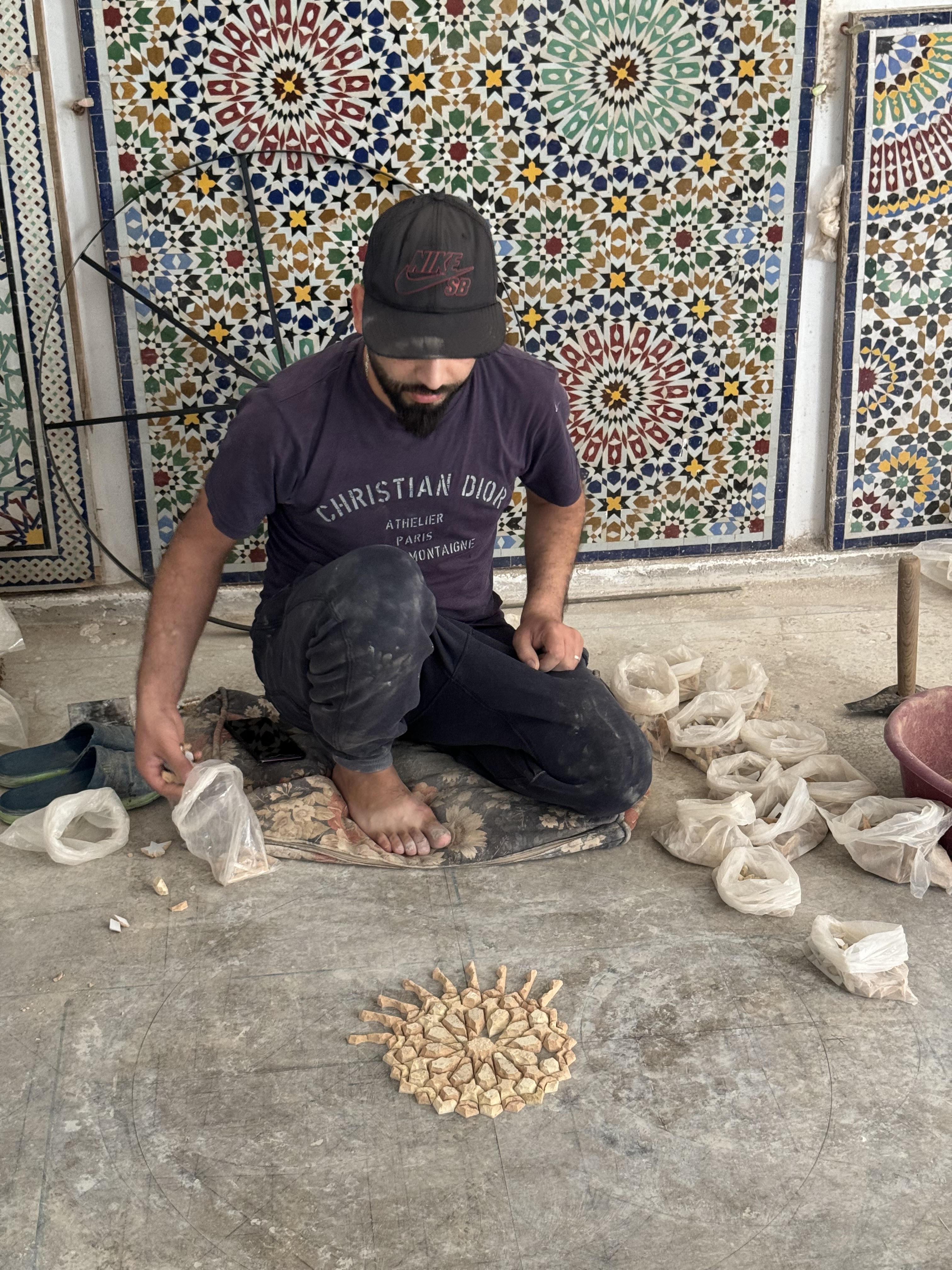 Today we explored Fes with a local guide. We started at the Royal Palace, then visited the old Jewish quarter, followed by a scenic overlook, and then stopped by a ceramics school that attracts students from all over the world. Finally, we explored the old Medina. The Medina is so complicated and convoluted that a local guide is required. There is no way anyone could navigate the over 9,400 streets and alleyways if they did not already know the layout. The Medina is a self-sustaining city within a city. It was founded between 789 and 808 A.D. and is considered as one of the most extensive and best conserved historic towns of the Arab-Muslim world. Inside the Medina you can find schools, fondouks (mediaeval building designed as an urban hostel for commercial travellers and merchants), palaces, residences, mosques (over 300), fountains, and any type of merchant, store, or craftsperson you think of, even a camel butcher.
