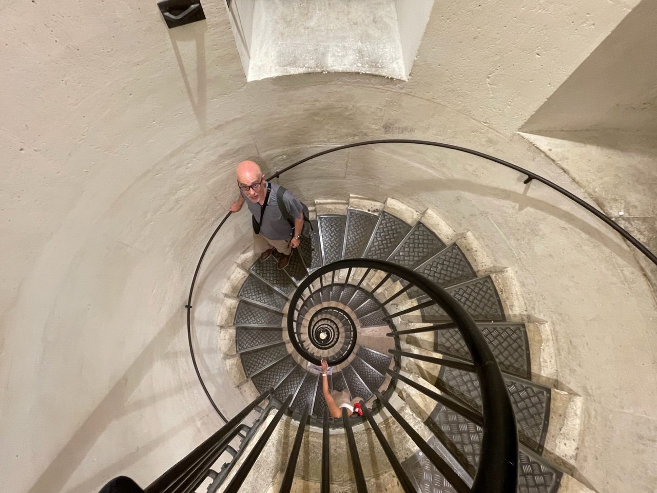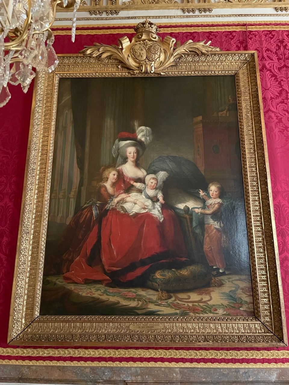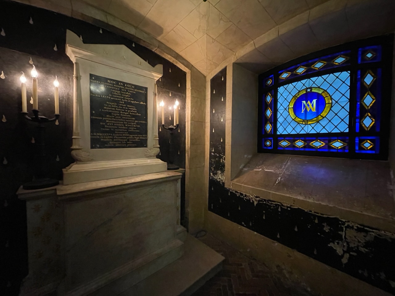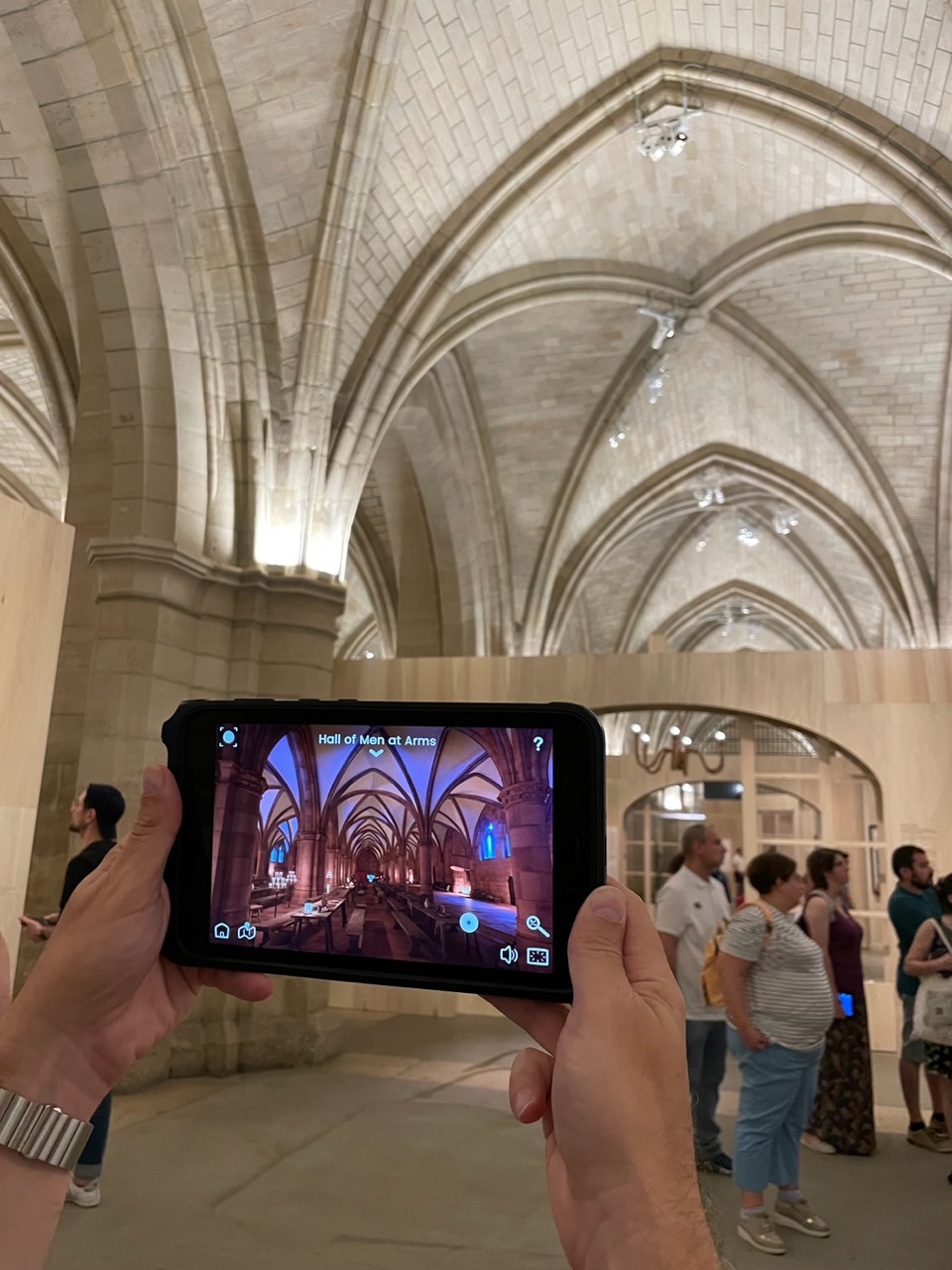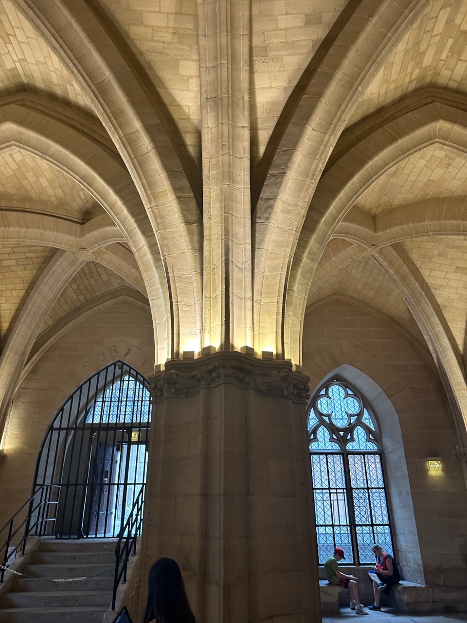We had a little bit of time before our planned trip to Versailles, so we bought tickets again for Sainte Chapelle, a gothic-style royal chapel built in the 1200s. Our tickets included access to the Conciergerie, a former courthouse and prison. During the French Revolution, thousands of prisoners, including Marie-Antoinette, were imprisoned, tried, and sentenced at the Conciergerie, then sent to different sites to be executed by the guillotine. The Conciergerie offered a free tablet with an AR feature that showed how the space would have looked at the time.